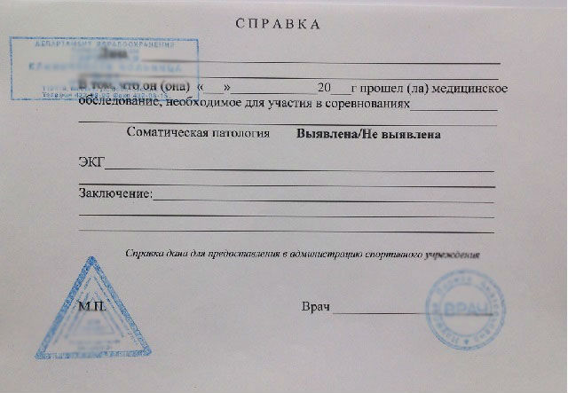 Выдачей справок и допусков к соревнованиям занимаются государственные физкультурные диспансеры и частные клиники. В документе указываются следующие данные: